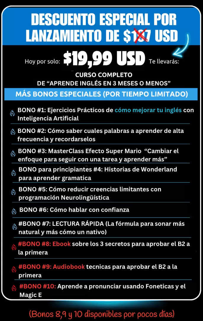 Este producto es para hispanohablantes que se sienten frustrados con los métodos tradicionales para aprender inglés y necesitan resultados rápidos y efectivos. Está diseñado para aquellos que quieren optimizar su aprendizaje utilizando técnicas innovadoras como la Inteligencia Artificial y la Programación Neurolingüística. Es ideal para personas con poco tiempo, que buscan mejorar su fluidez para exámenes de Cambridge o situaciones profesionales, y que además necesitan superar bloqueos mentales para avanzar en su aprendizaje.